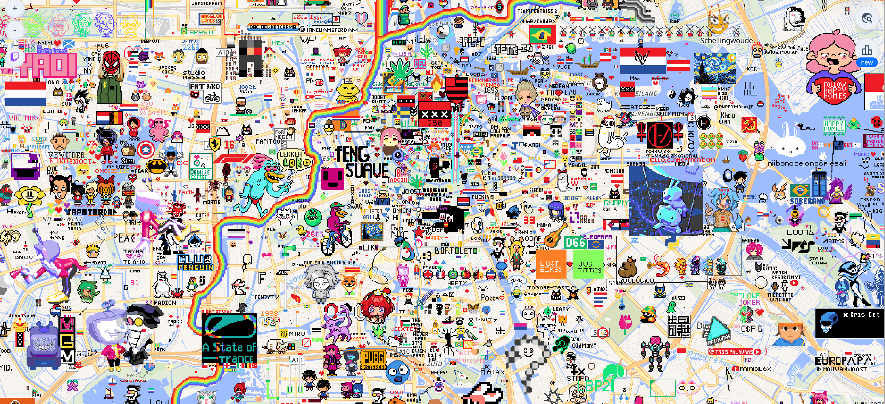 wplace is een wereldkaart waar iedereen op kan tekenen, geïnspireerd door het online evenement 'r/place' op Reddit. Dat ziet er zo uit in Amsterdam: